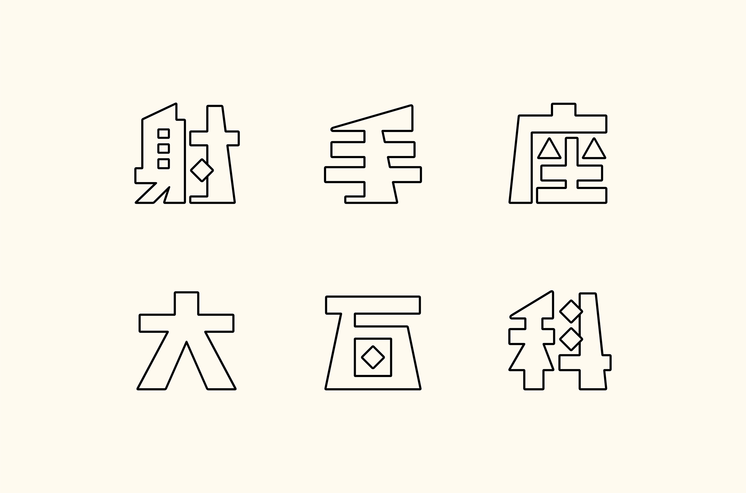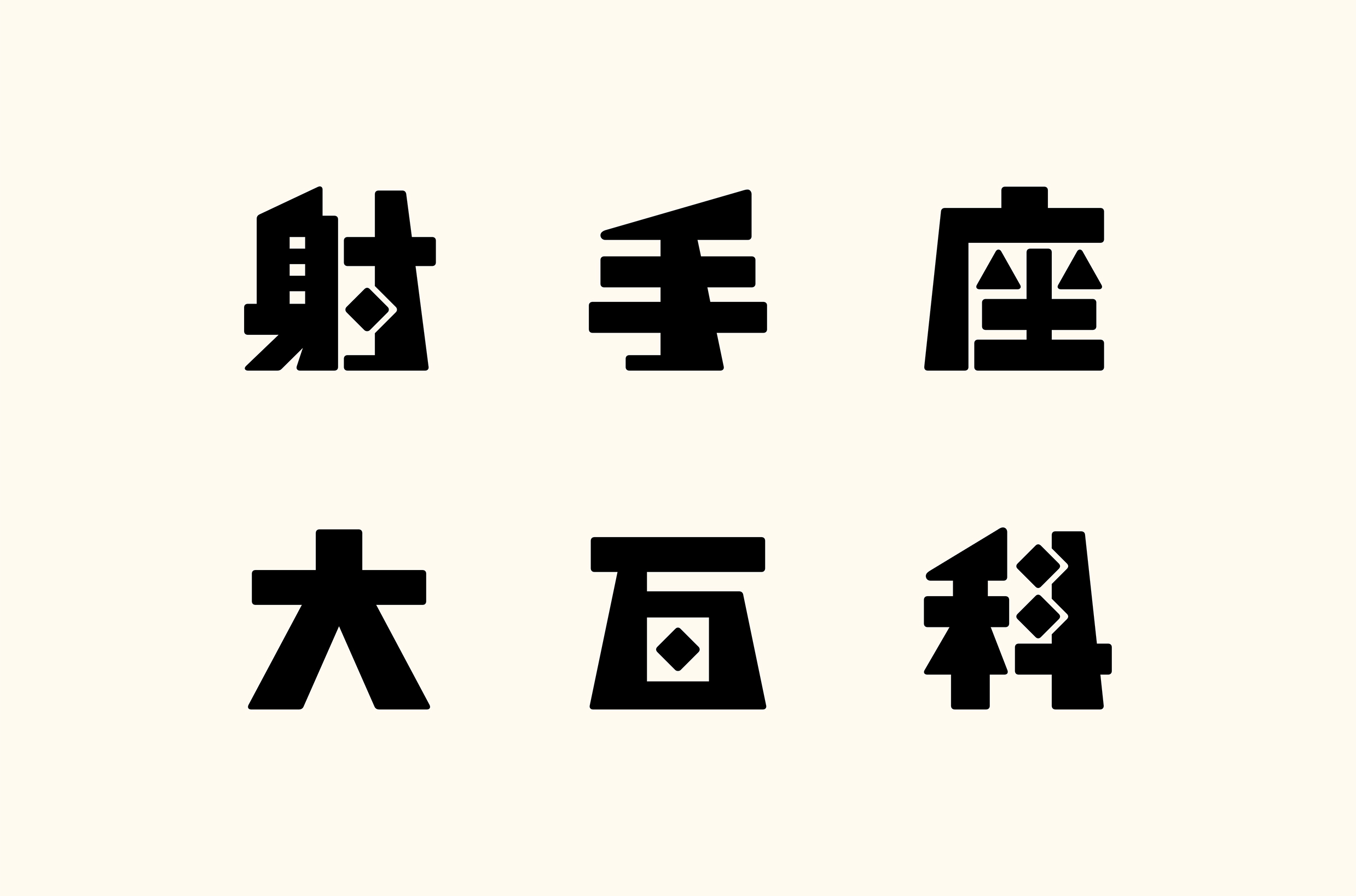 右上がりに書かれたストロークや詰め気味で組んだときの表情に、勢いや賑わいが表現されることをイメージして制作した太めのディスプレイ書体。書道で使う筆で書かれたときの動きよって生まれる表情や、向かって右側が少し前に迫り出して見えるような遠近感を取り入れています。