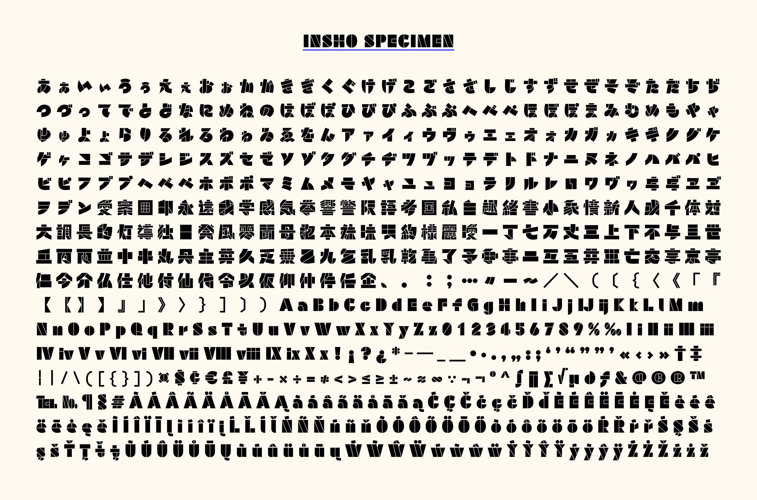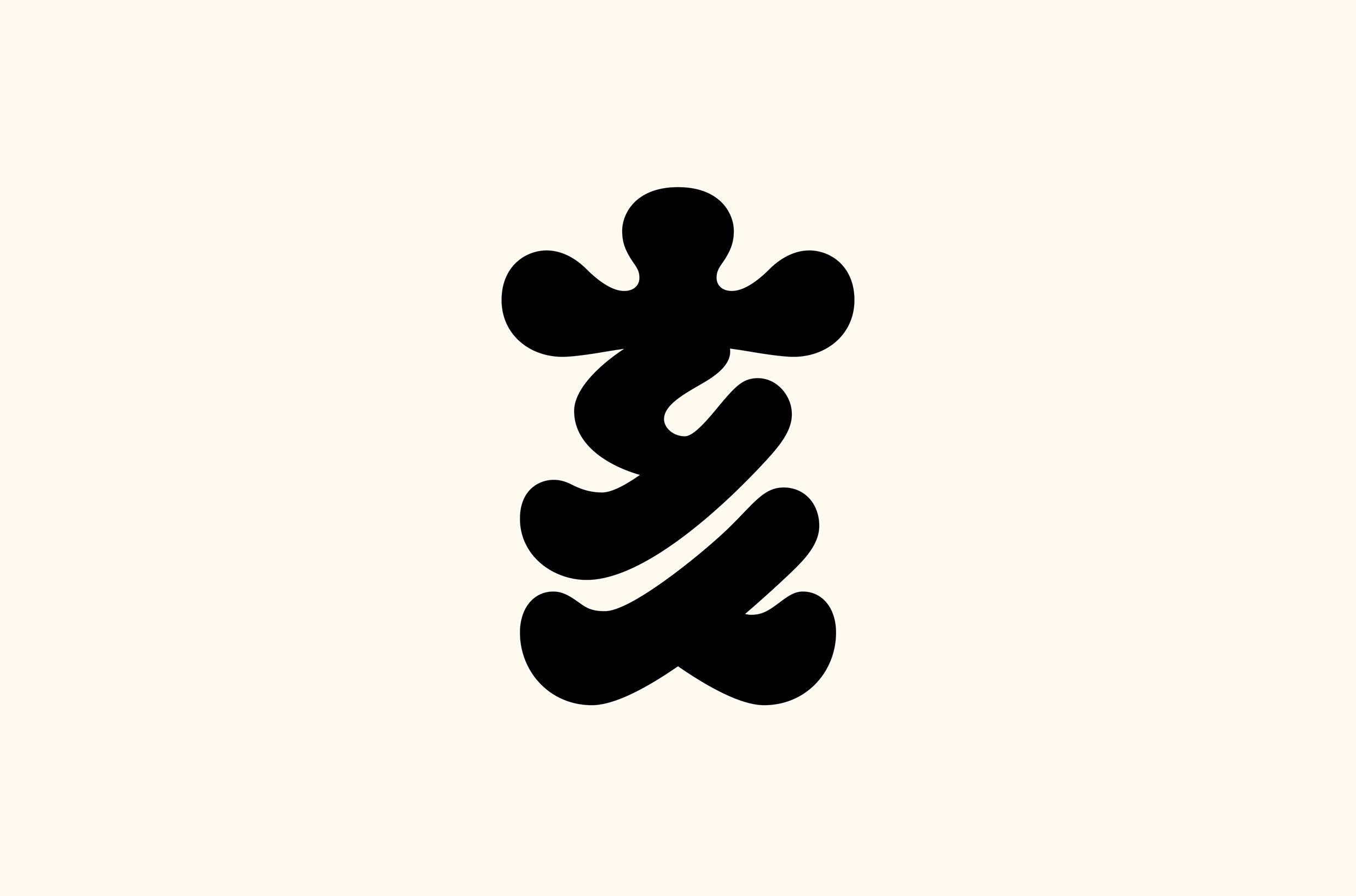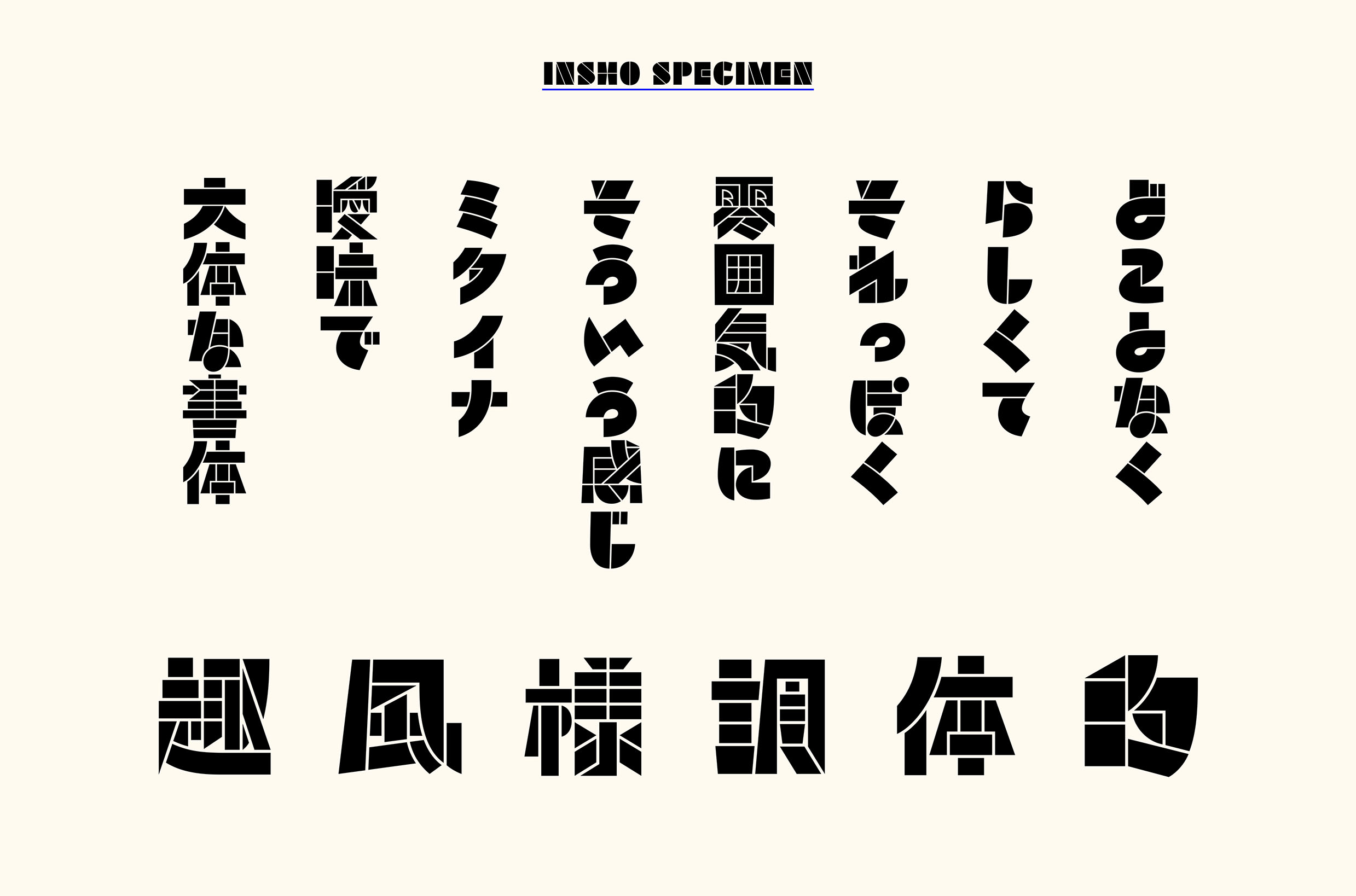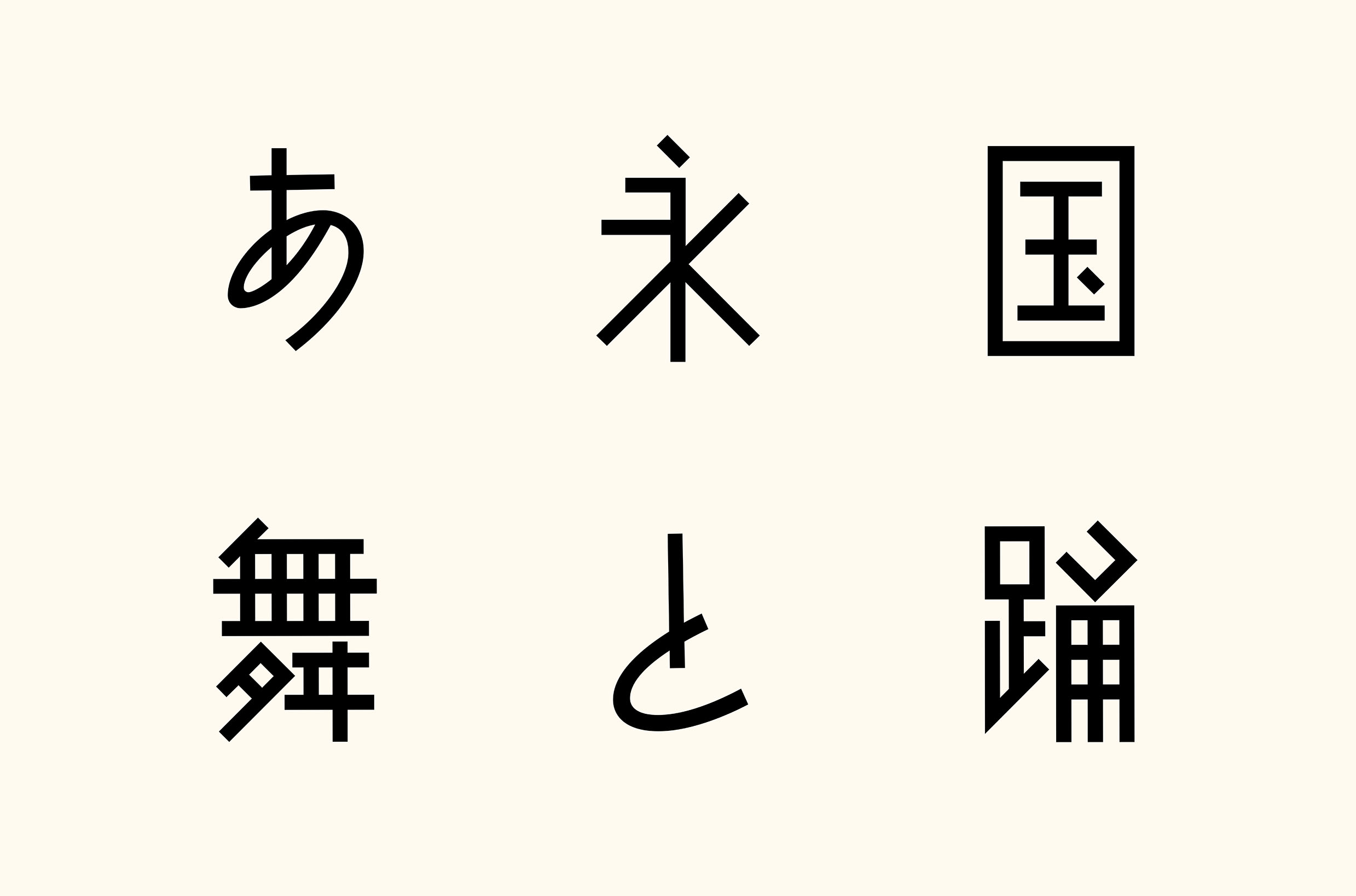 右上がりに書かれたストロークや詰め気味で組んだときの表情に、勢いや賑わいが表現されることをイメージして制作した太めのディスプレイ書体。書道で使う筆で書かれたときの動きよって生まれる表情や、向かって右側が少し前に迫り出して見えるような遠近感を取り入れています。