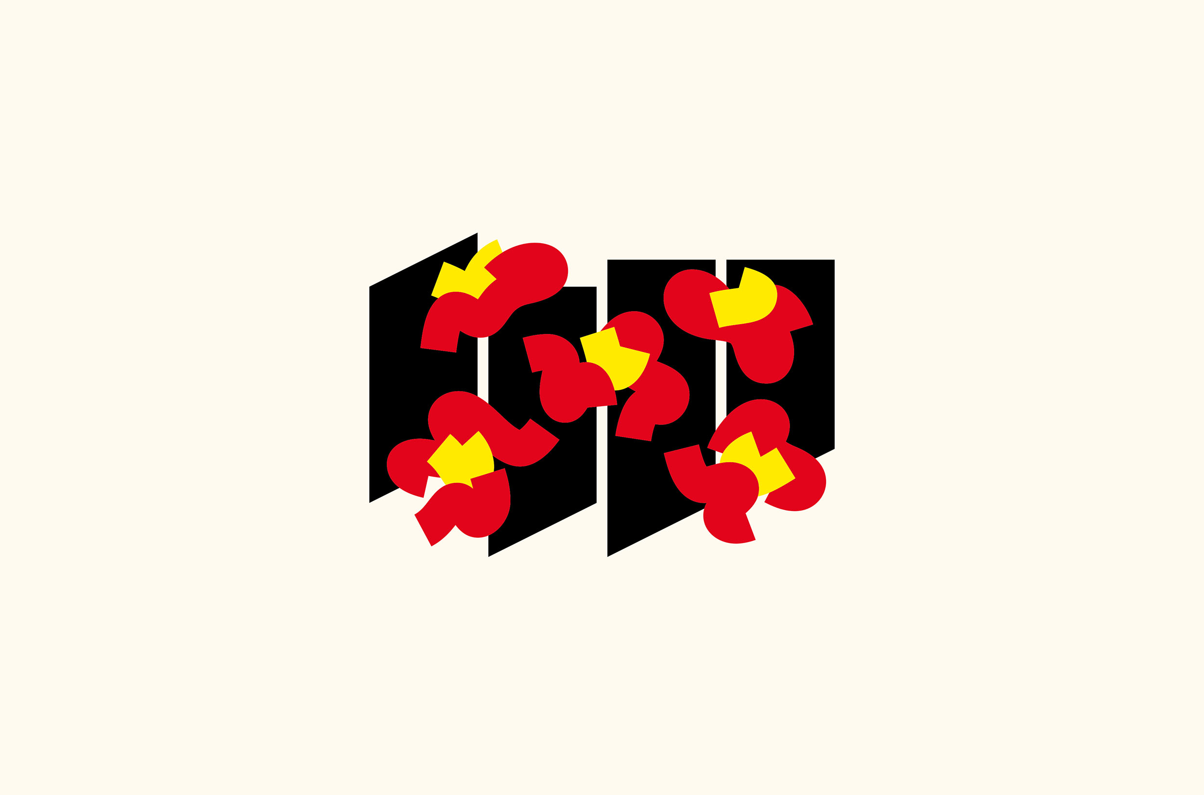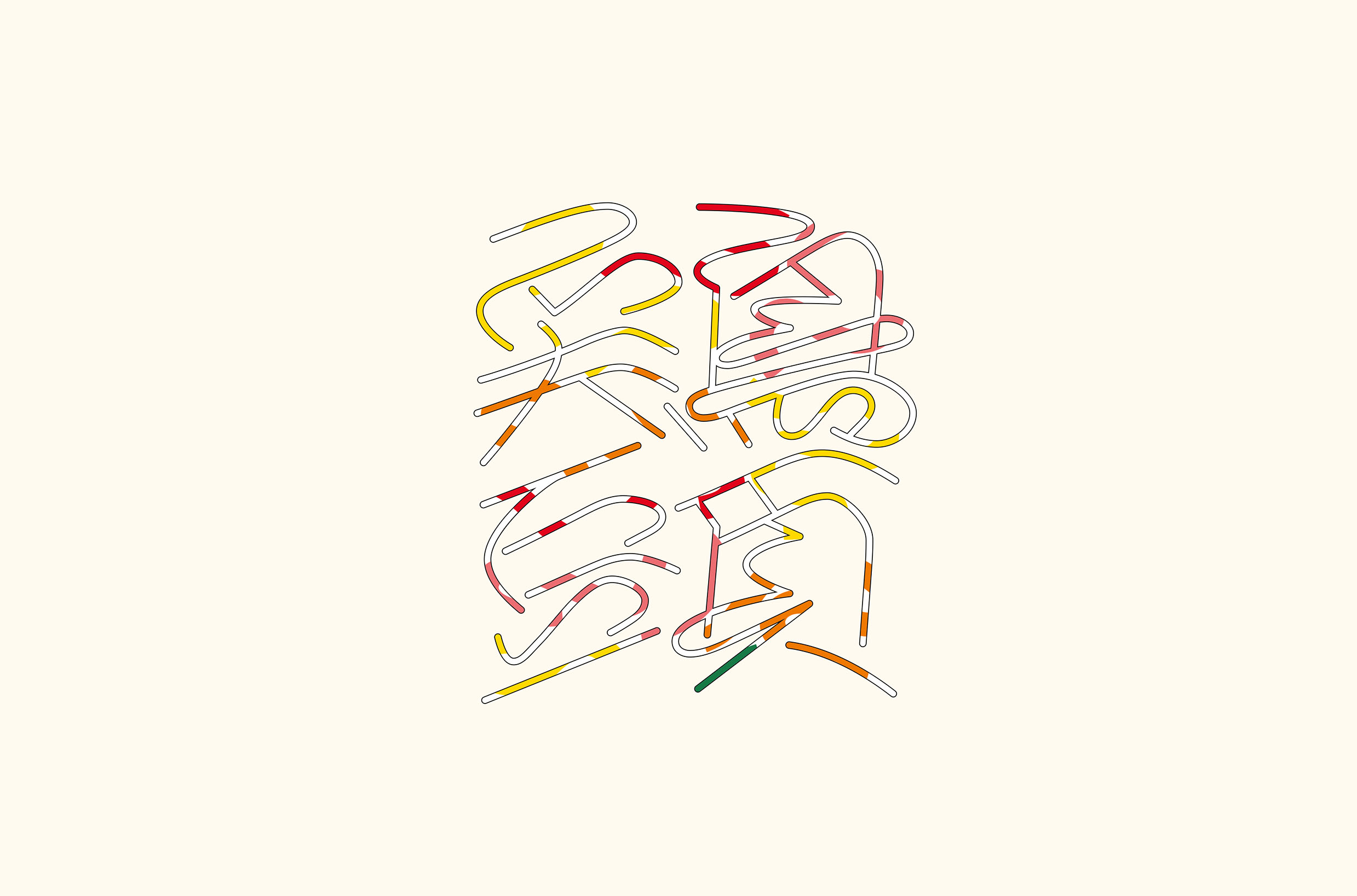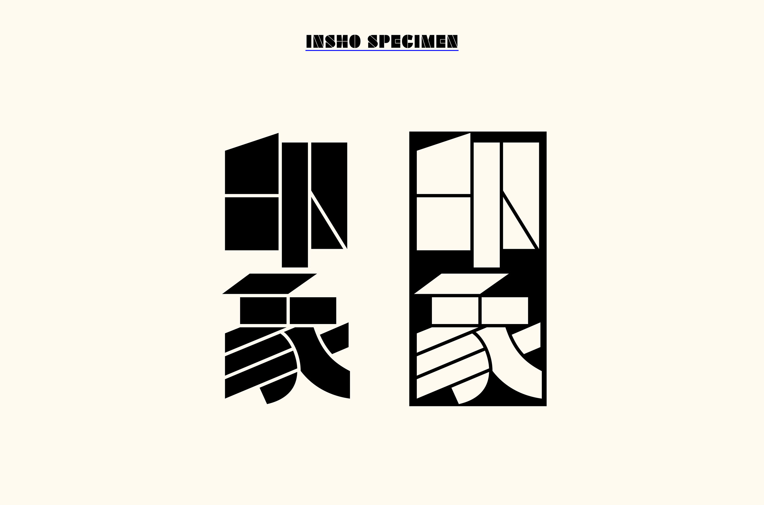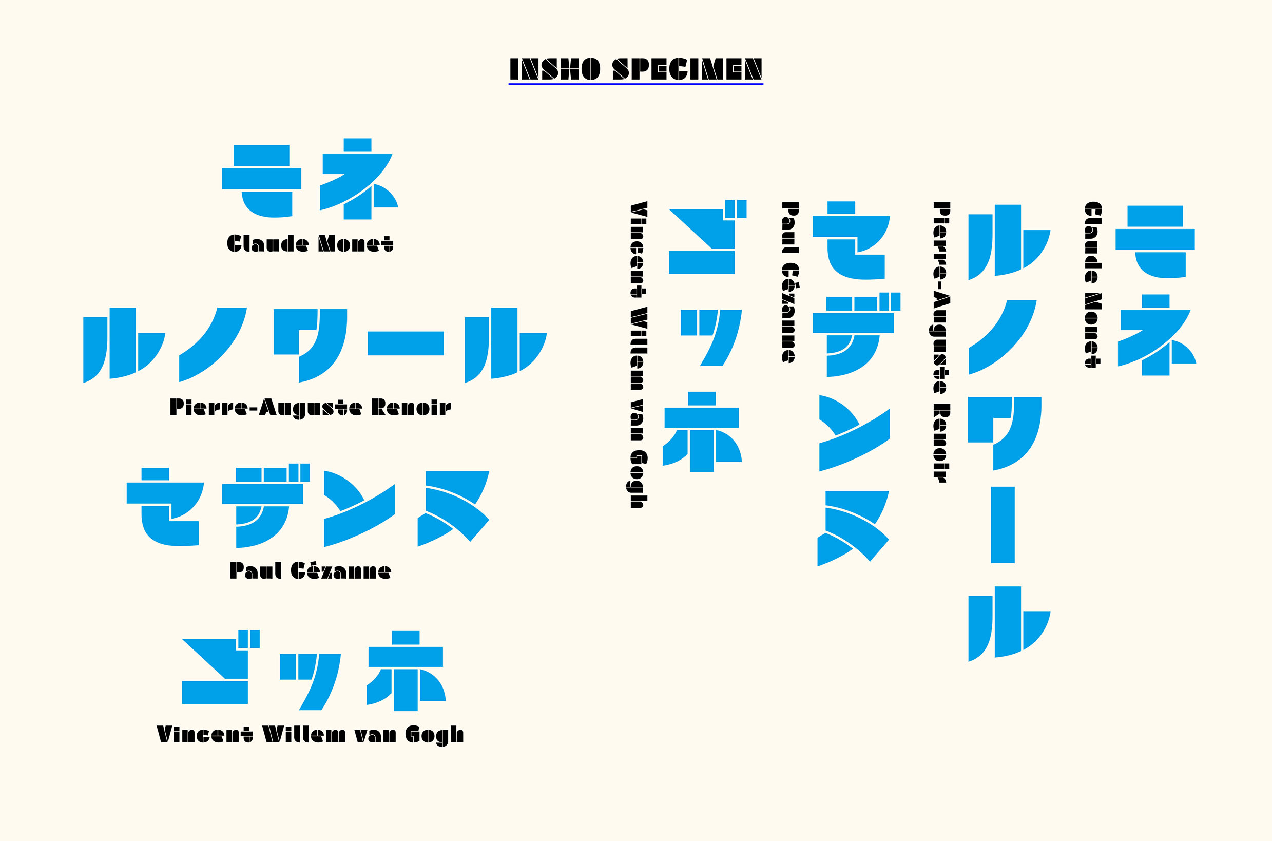 右上がりに書かれたストロークや詰め気味で組んだときの表情に、勢いや賑わいが表現されることをイメージして制作した太めのディスプレイ書体。書道で使う筆で書かれたときの動きよって生まれる表情や、向かって右側が少し前に迫り出して見えるような遠近感を取り入れています。