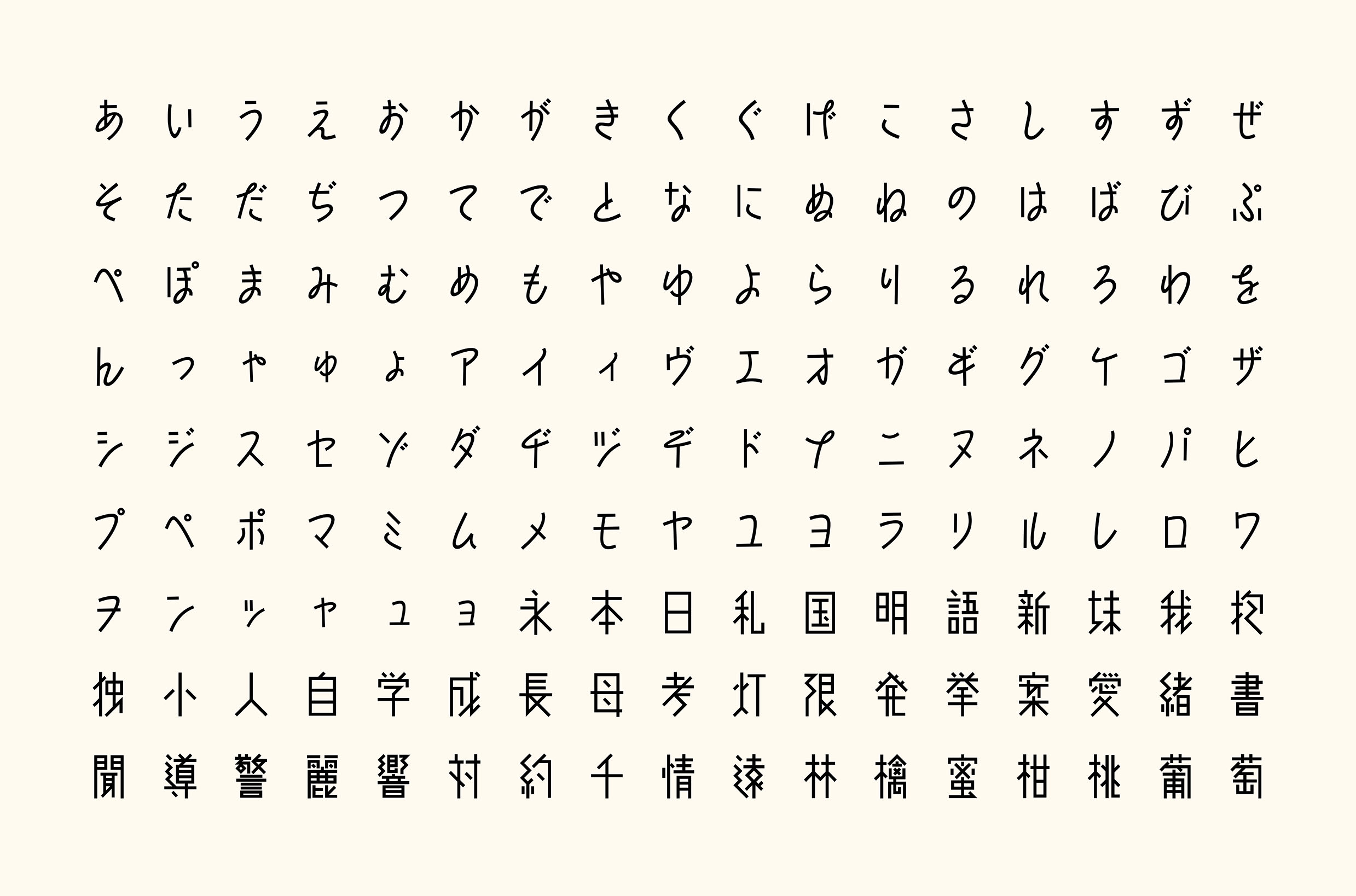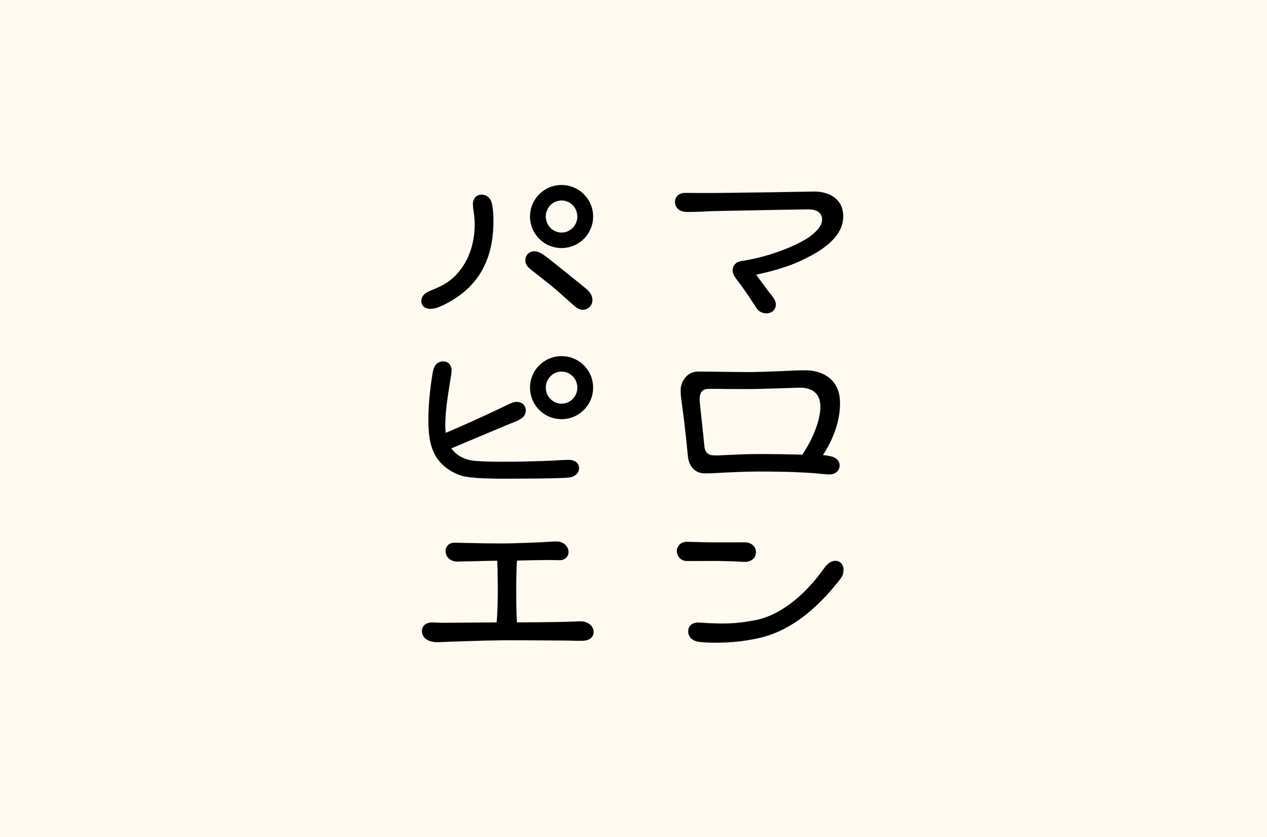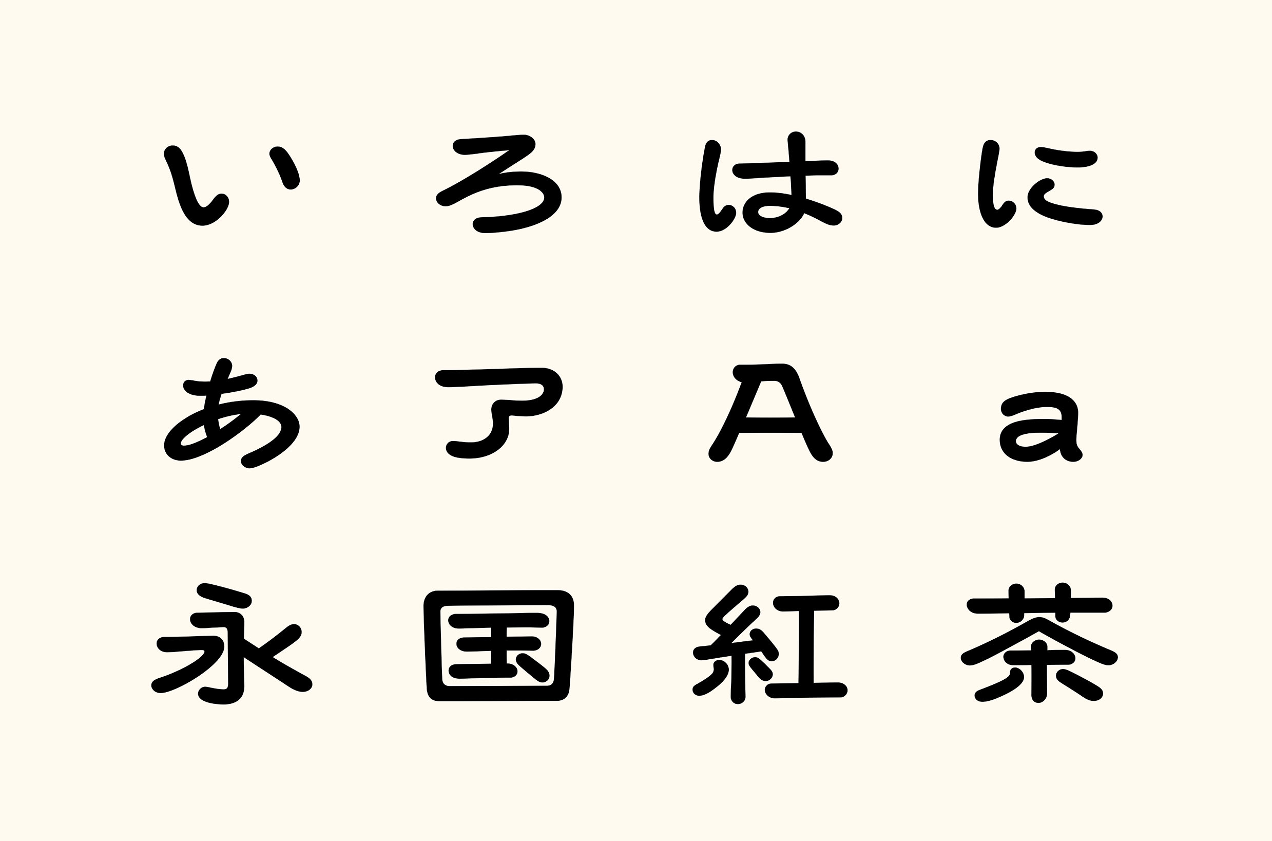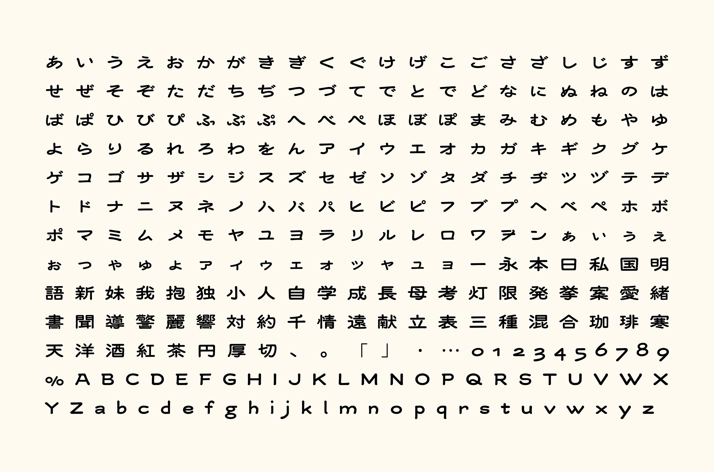 組んだ表情にユニークさを求めて制作した丸ゴシック体。75%の扁平がかったプロポーションが特徴で、その丸みのある表情の中に「とぼけてはいるけどどこか憎めない」そんなキャラクターが生まれることを目指して制作しました。